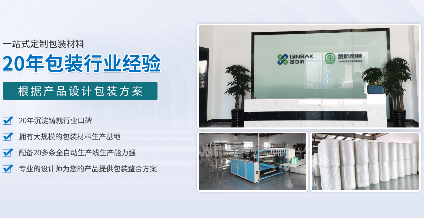 苏州金百科新材料科技有限公司创始于2003年,位于全国百强县——昆山市张浦镇鑫阳路46号,是一家提供整体包装的设计方案、新型包装材料的研发、一站式包装材料的整合、包装材料电商销售的民营企业,立足昆山辐射长三角。